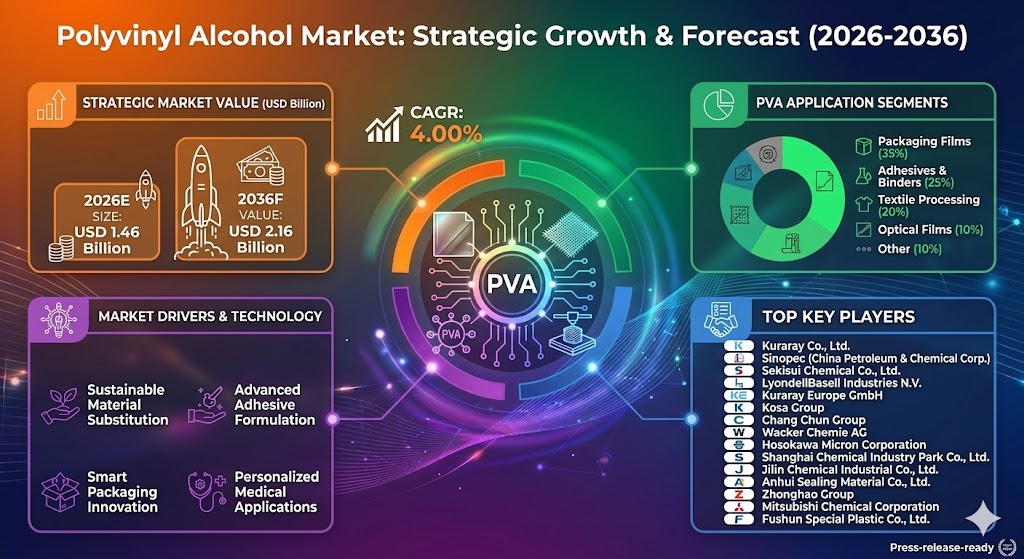 ROCKVILLE, MD, UNITED STATES, April 9, 2026 /EINPresswire.com/ — According to Fact MR, latest analysis, the global polyvinyl alcohol (PVA) market is valued at USD 1.40 billion in 2025 and is projected to reach USD 1.46 billion in 2026, expanding to USD 2.16 billion by 2036 at a CAGR of 4.0%. The market is set to generate an incremental opportunity of approximately USD 0.70 billion over the forecast period.