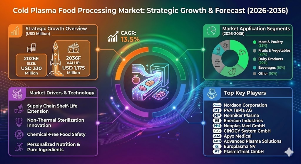 ROCKVILLE, MD, UNITED STATES, April 9, 2026 /EINPresswire.com/ — According to Fact MR, latest analysis, the global cold plasma food processing market is transitioning from pilot-scale innovation to commercial deployment, valued at USD 290 million in 2025 and projected to reach USD 330 million in 2026. The market is expected to expand significantly to USD 1,175 million by 2036, registering a strong CAGR of 13.5% and creating an incremental opportunity of USD 845 million.